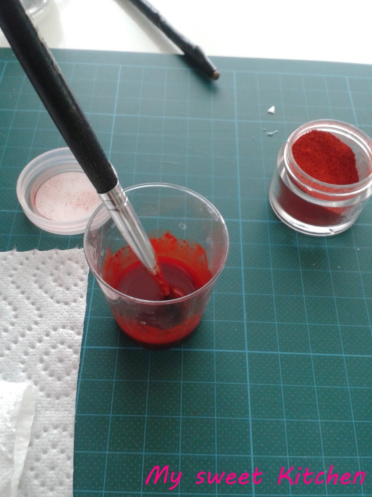 Pulverfarbe mit ein paar Tropfen Alkohol zu einer Paste verrühren und mittels dem Kosmetikschwämmchen auftragen.